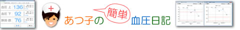 | 【 あつ子の簡単血圧日記 】 平均値や前回値から上か下かもひと目でわかる。簡単操作で長く続けられる血圧・脈拍記録ソフト → Vector:あつ子の簡単血圧日記 | |