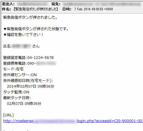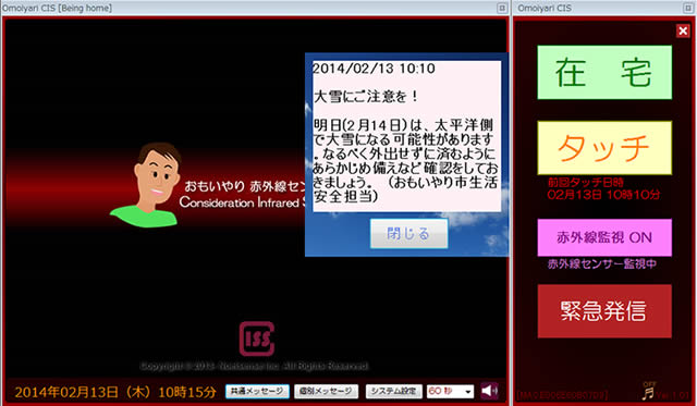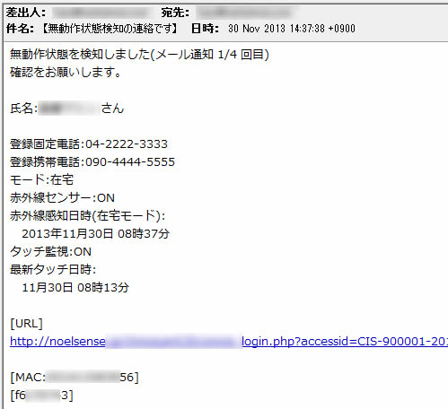 在宅モード時は、赤外線センサーは指定した時間で動体を感知しなかった場合は、無動作として検知した旨を電子メールにて指定されたメールアドレス(本人を除く最大5メールアドレス)に対してメール配信を行います。(注:警察・消防署等への通報は行いません) |