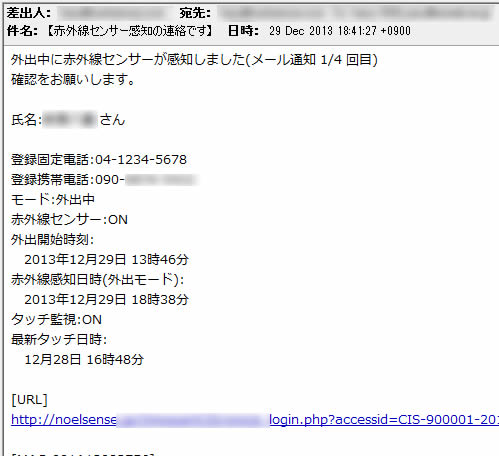 外出モード時(不在時)は、赤外線センサーが動体を感知した場合に、その旨を電子メールにて指定されたメールアドレス(本人を除く最大5メールアドレス)に対してメール配信を行います。(注:警察・消防署等への通報は行いません) |