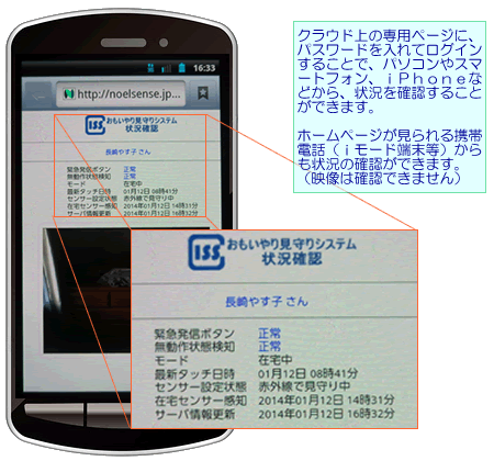 クラウド上の専用ページにパスワードを入れてログインすることで、外部から状況を確認することができます。 |
